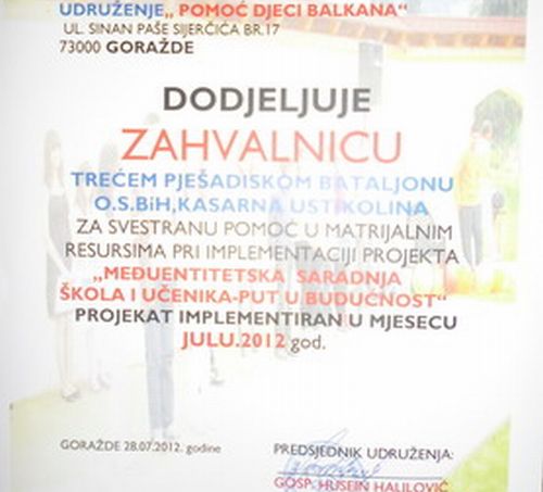 Ovom prilikom dodijeljena je i zahvalnica 3.pješadijskom bataljonu za pružanje podrške u resursima bez kojih se ovaj projekat ne bih mogao implementirati.